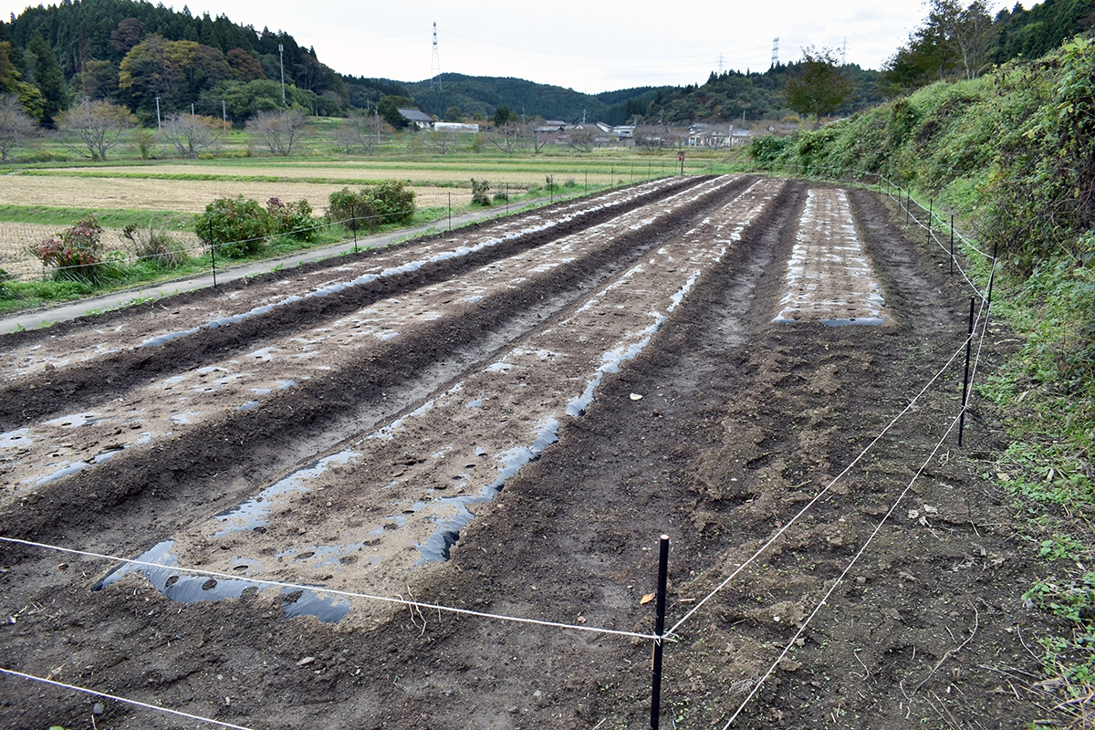 にんにくは、8月から約2カ月かけて土づくりを行い、10月に植え付けを行っています。大量に堆肥を投入し、石灰などによりpHを調整しつつ栄養分を補給するなど、土づくりからこだわっているそう。こちらの圃場には、約4000個が植え付けられています。