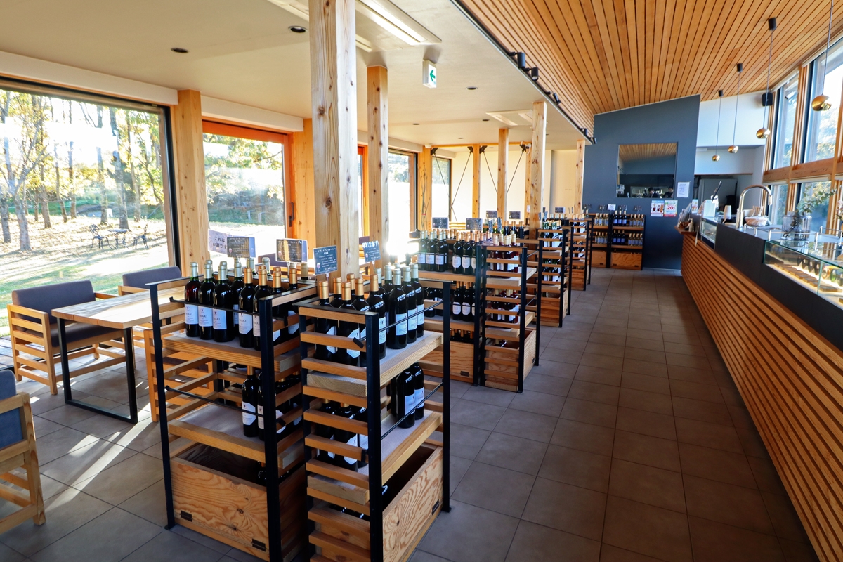 「いわきワイナリーガーデンテラス&ショップ」では、常時約25種類のワインを販売。有料でテイスティングも楽しめるほか、ワインセラー見学やぶどう栽培体験もできます。(要予約)