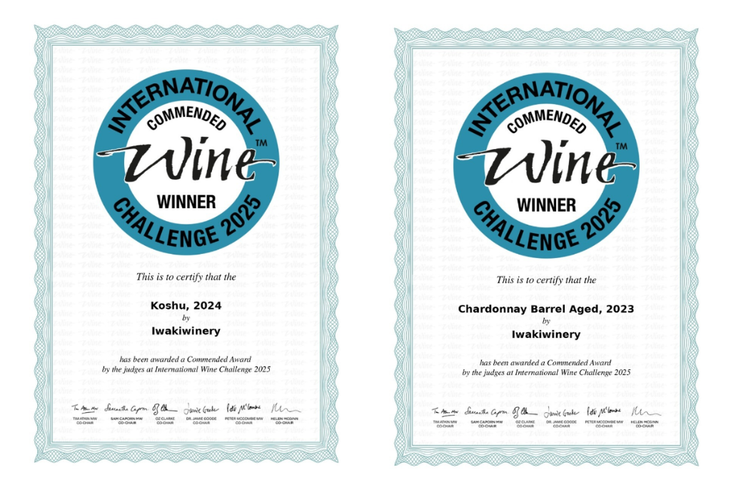 数あるワインの中でも四家さんのお勧めは、「甲州2024」「シャルドネ樽熟成2023」「メルロー2022樽熟成」の3本。「甲州2024」と「シャルドネ樽熟成2023」は、“世界でもっとも大きな影響力を持つワインコンテスト”とも言われる「IWC(インターナショナル・ワイン・チャレンジ)」で入賞を果たしました。