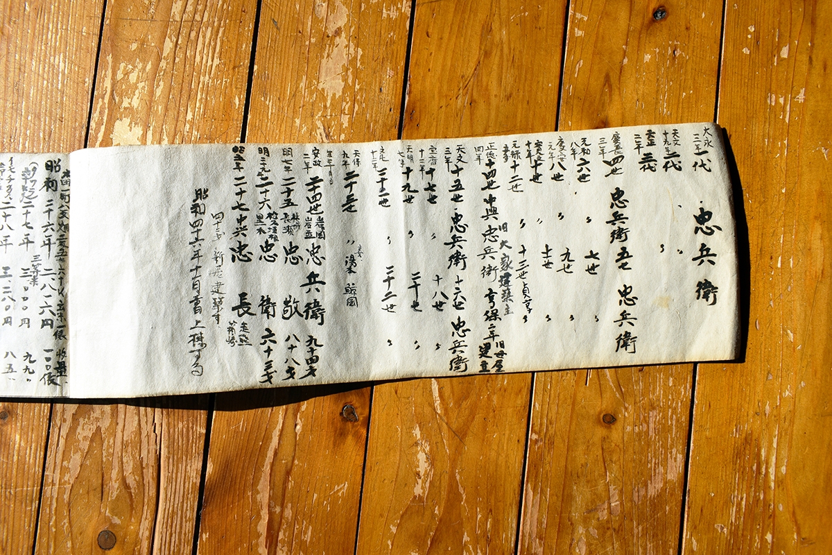 こちらは鈴木忠光さんの自宅に保管されている「大福帳」。忠光さんの祖父忠長さんが、昭和33年にまとめました。室町時代の大永3年(1523年)の初代忠兵衛から現代までの系譜が記されています。これにより忠光さんは自分が29代目であることを知りました。