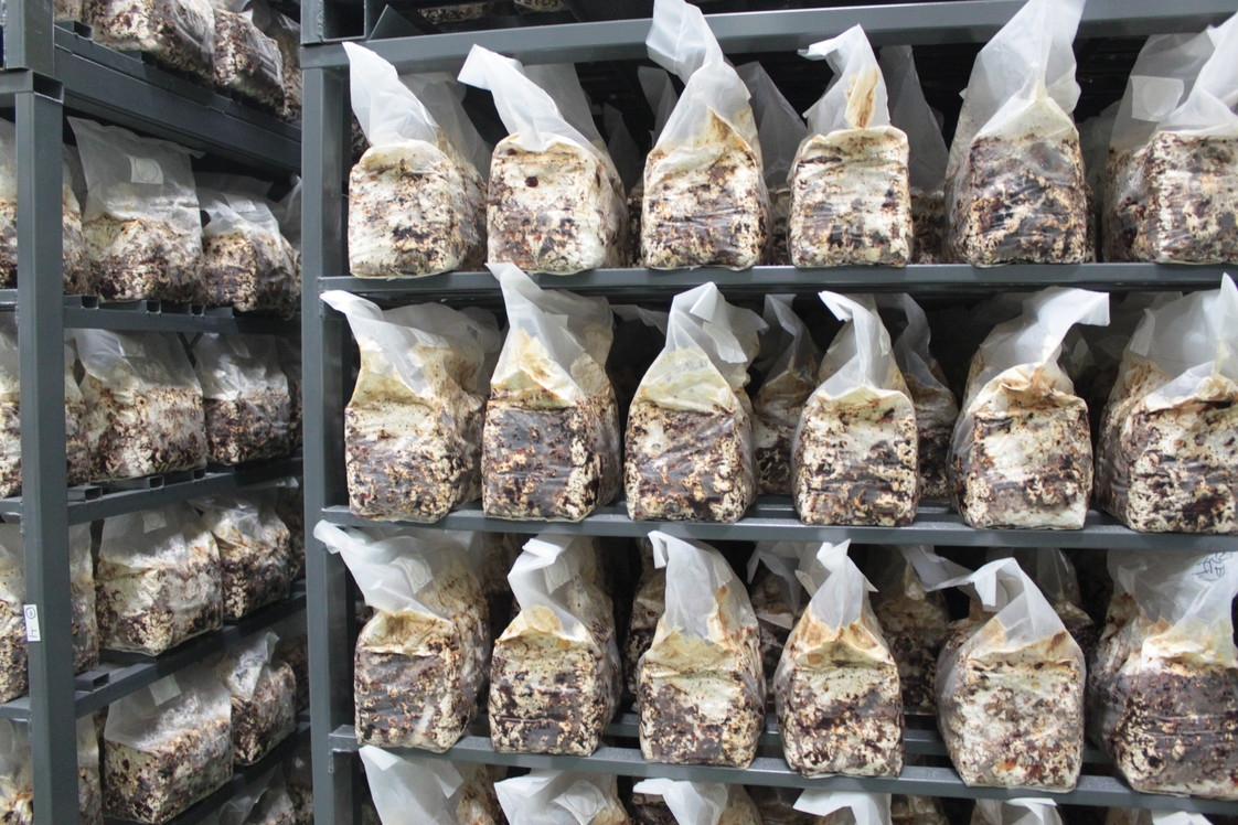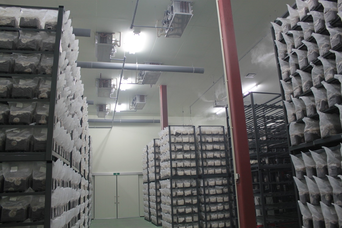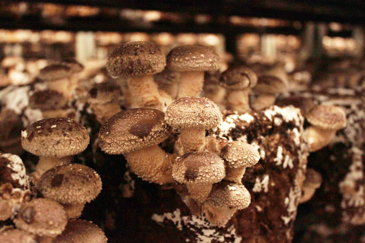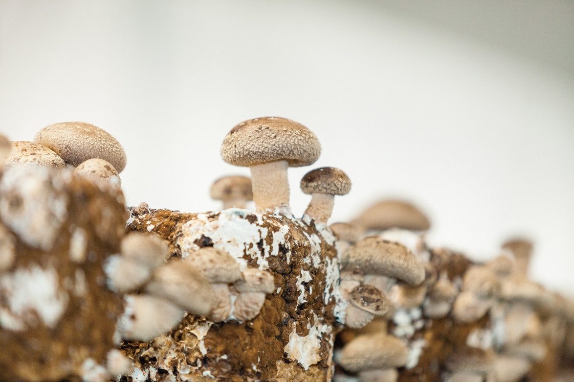 培養を経て、菌床が出来ると袋を外し、室温を一定に管理し椎茸を発生させます。