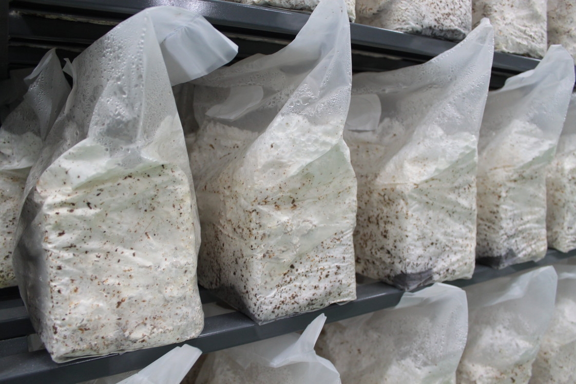 椎茸の菌を接種後、温度湿度を調整管理し、菌床が形成されます。