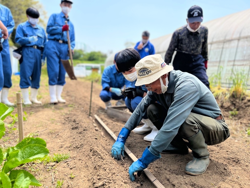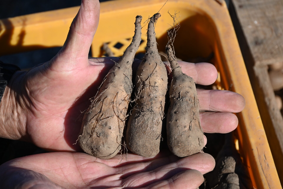 4月上~中旬に、前年度にむかごから育てた種芋を植え、11月頃から収穫・出荷しています。