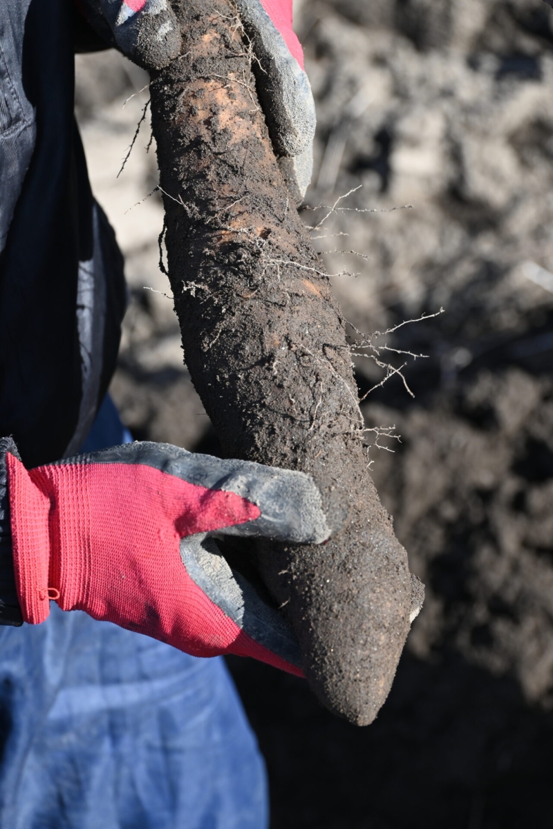 トラクターで余分な土を掘り起こし、溝掘り用の細長いスコップで、傷がつかないように丁寧に掘り上げます。