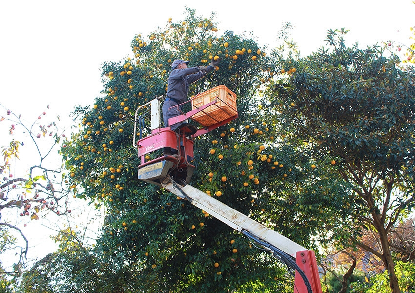 収穫の際には、高所作業車を使って収穫します。