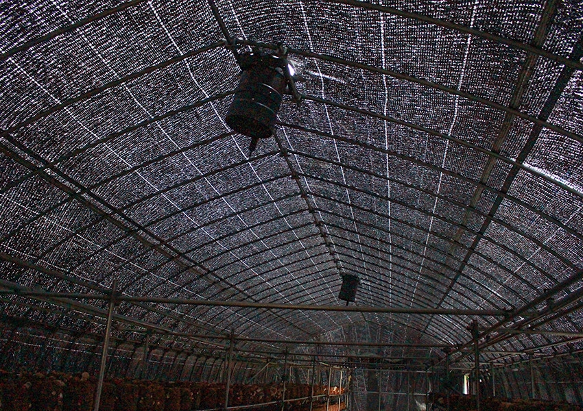 森と同じ環境を作るためハウスに黒いシートを二重に被せ直射日光を浴びせないよう温度管理を徹底しています。