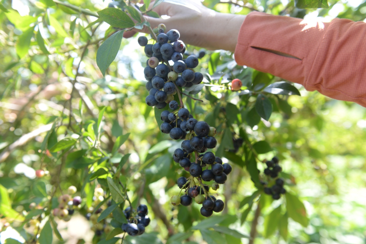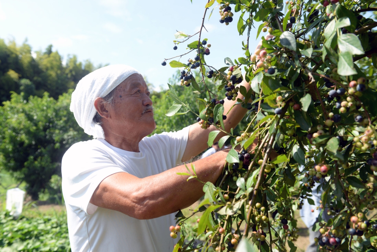 鈴なりに実るブルーベリー。家族とスタッフで作業していますが、太陽光が降り注ぐ真夏は半日で熟してしまい、収穫が間に合わないほど。摘み取り体験で生食できるほか、お土産用のパック販売、急速冷凍のブルーベリーも人気です。