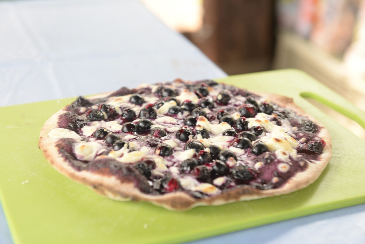 大和田自然農園では、雅夫さん手作りの石釜でピザ作り体験もできます(土日限定・要予約)。こちらは、意外にもチーズとマッチするブルーベリーのピザ。採れたて果実がたっぷり乗った、ブルーベリー農園ならではの贅沢な一品です。ほかにも、野菜のピザ、蜂蜜たっぷりチーズピザも大人気です。