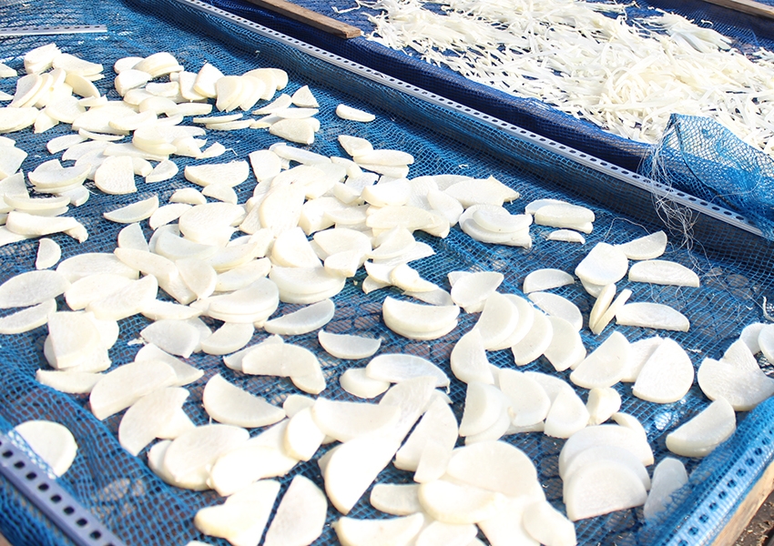 収穫した大根の一部も千切りや半月切りにし、じっくり干して切り干し大根にしています。