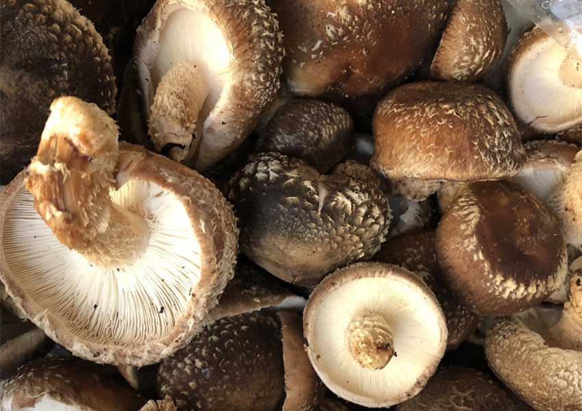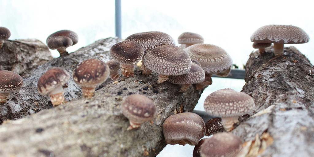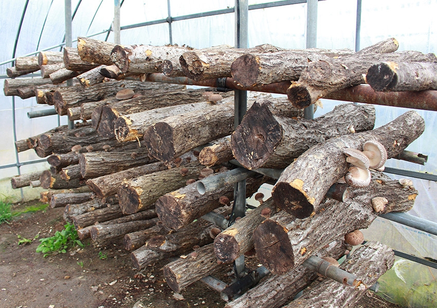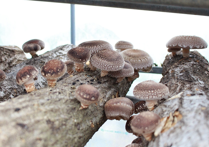 原木椎茸は暖かいハウスの中で少量の水を2~3日おきにかけると、厚みがあり風味豊かで日持ちのする立派な椎茸に育ちます。