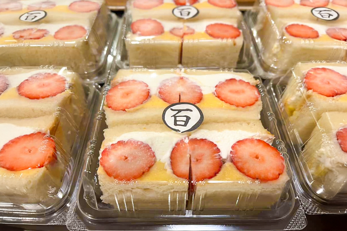 小名浜の人気パン屋「ひゃくにんぱん」では、草野いちご園のいちごを生クリームと自家製のカスタードクリームをたっぷり塗った食パンで挟んだ、「いちごサンド」を販売しています。見た目も味もボリュームも「百」点満点の、贅沢なフルーツサンドです。