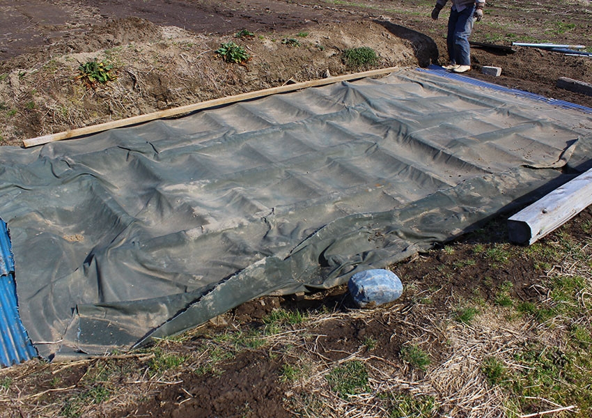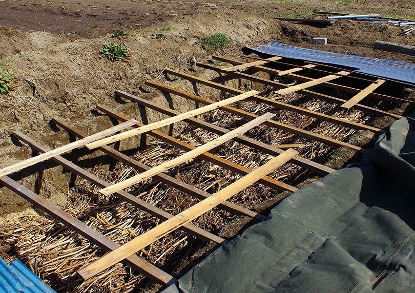 うどの栽培は、霜と風を防ぐシートの下に掘られた穴にもみ殻を敷き詰め、その中でうどを育てます。