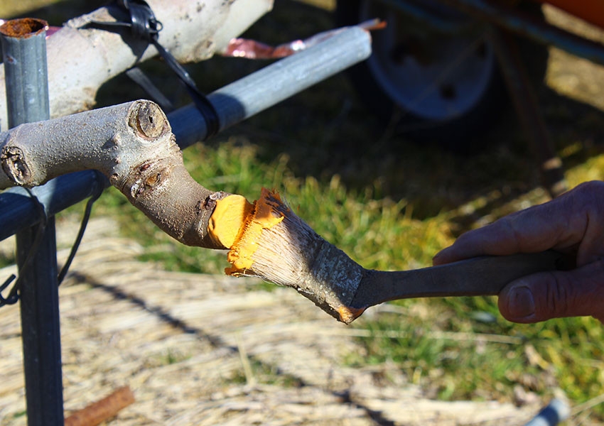 剪定作業で枝を切った後、枝の切り口に塗布剤を付けることで乾燥や病気を防ぎます。