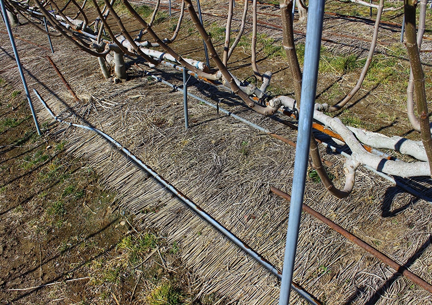 土に敷いてある藁には乾燥防止と泥はねを防ぐ効果があり、土の中にある病気となる菌が葉や実につかないようにしています。