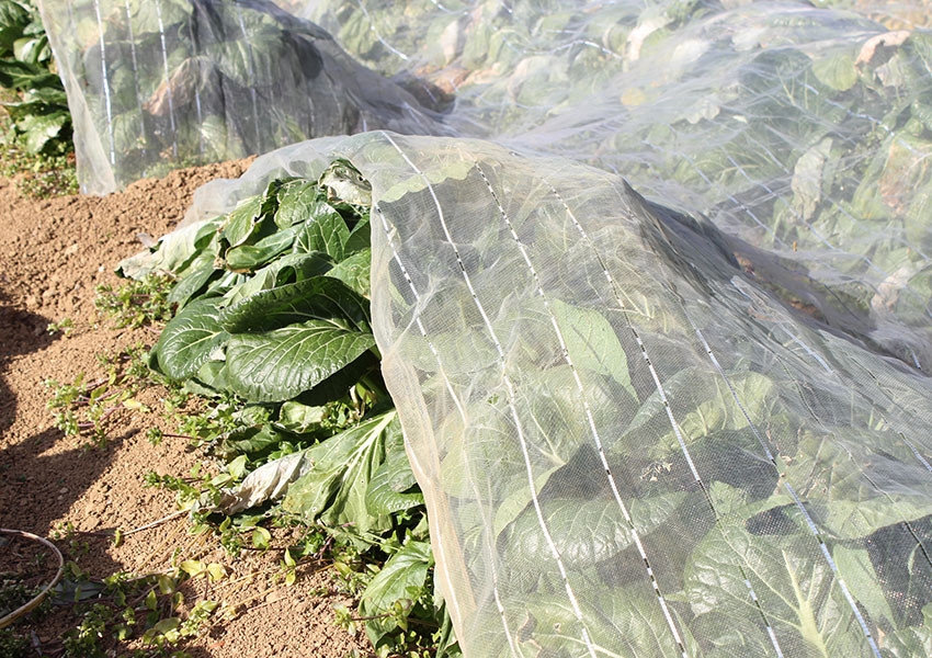 カラシナは、虫や鳥に食べられてしまうのを防ぐため、シートで覆う対策を講じています。田人町で栽培するうえでは、気候と鳥や動物等の影響も考えながら栽培しなければなりません。