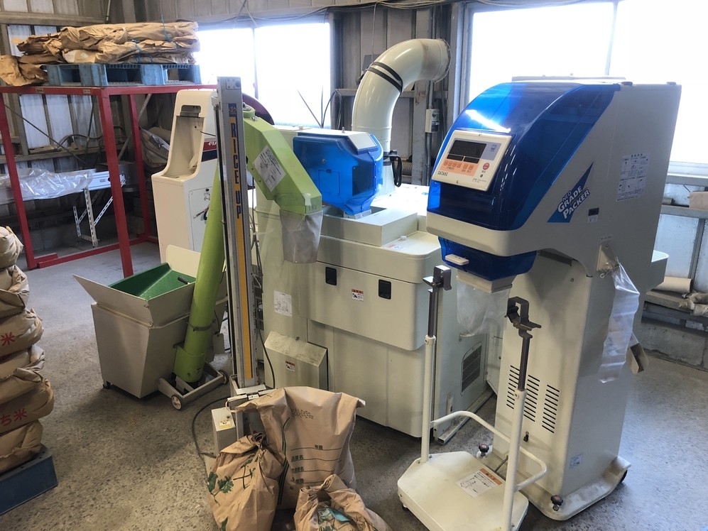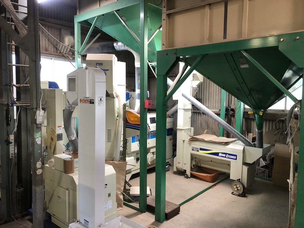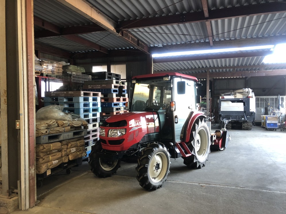 大きな倉庫にはトラクターなどの重機の他、精米機や色彩選別機などが配置され作業場にもなります。