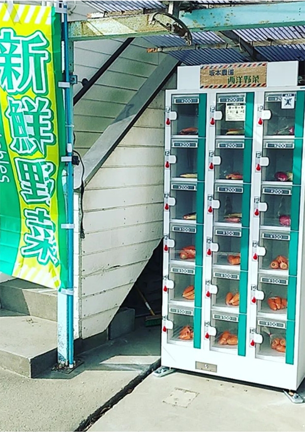 坂本農園の一部の野菜は、ご近所の坂本商店前のコインロッカー型販売機で購入可能です。