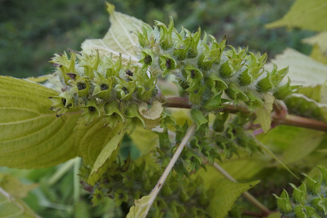 こちらは、収穫間近のじゅうねんのほ場です。背丈は新妻さんの身長を越すほどで、清涼感のある爽やかな葉の香りが、一面に広がります。