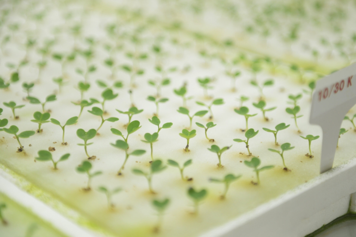 種をまいてから3日後には発芽し、7日ほどで緑化が完了すると、いよいよ定植です。定植作業は苗の発育状況を見ながら、スタッフの手で丁寧に行われています。
