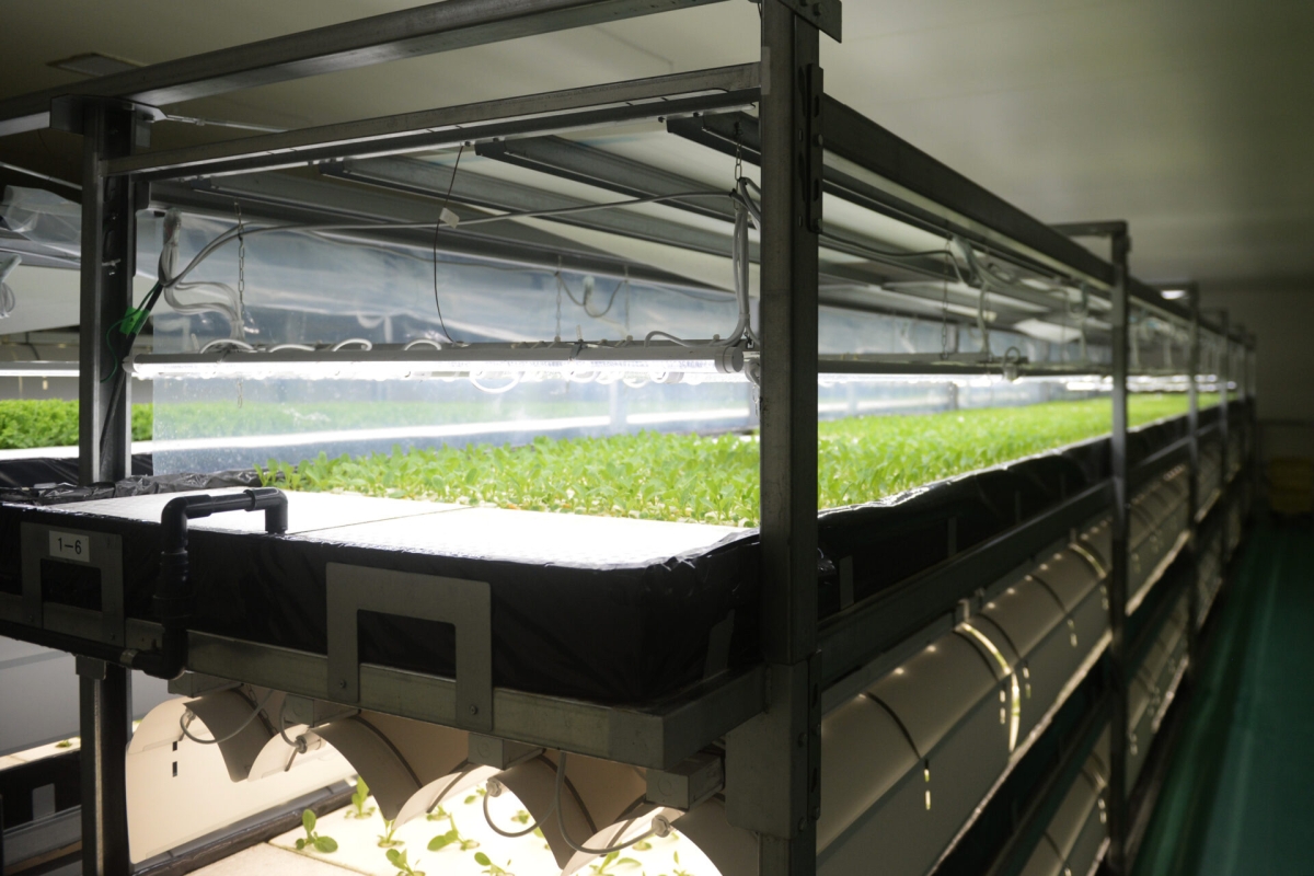 工場内には多層構造の植物ベッドがいくつも並び、限られた空間を最大限に活用する工夫が施されています。
