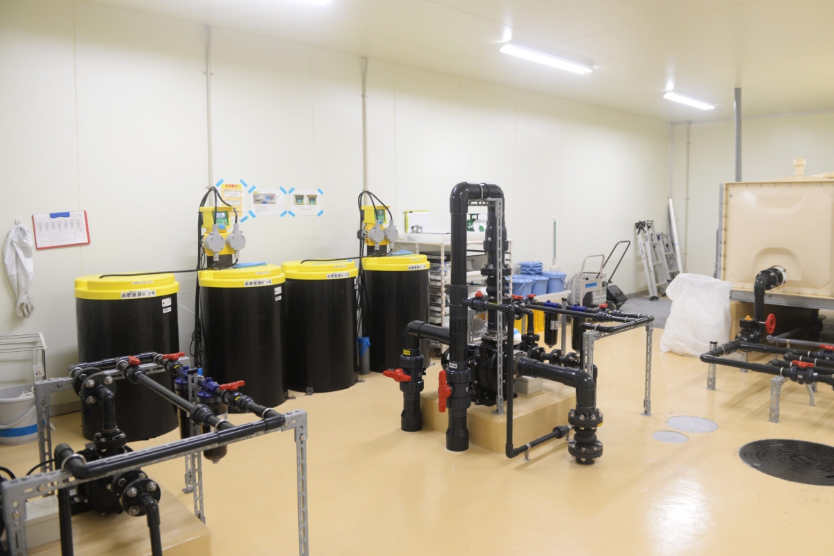 工場内の温度は21~22℃、CO2濃度はなんと外気の約5倍。光合成を促し、常に野菜が生育しやすい最適な環境を保っています。そのかなめになるのが、最新の設備を備えた機械制御室。ここで養液濃度、CO2濃度、温度、湿度などを調整しています。これらの設備によって『定価格、定品質、定時期、定量』の『4定栽培』を実現し、高品質で安心安全な野菜を市場へ供給することができているのだそうです。