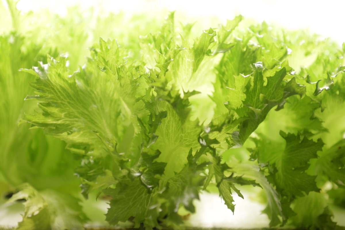完全閉鎖型の工場で野菜の生育環境を一定に保ち、無農薬・水耕栽培によってフリルレタス、サラダ小松菜の2種類を育てています。