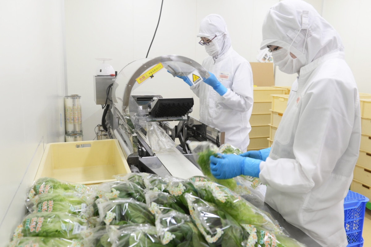 野菜工場では厳正な品質管理のもと、フリルレタスとサラダ小松菜合わせて1日2,700株を出荷しています。