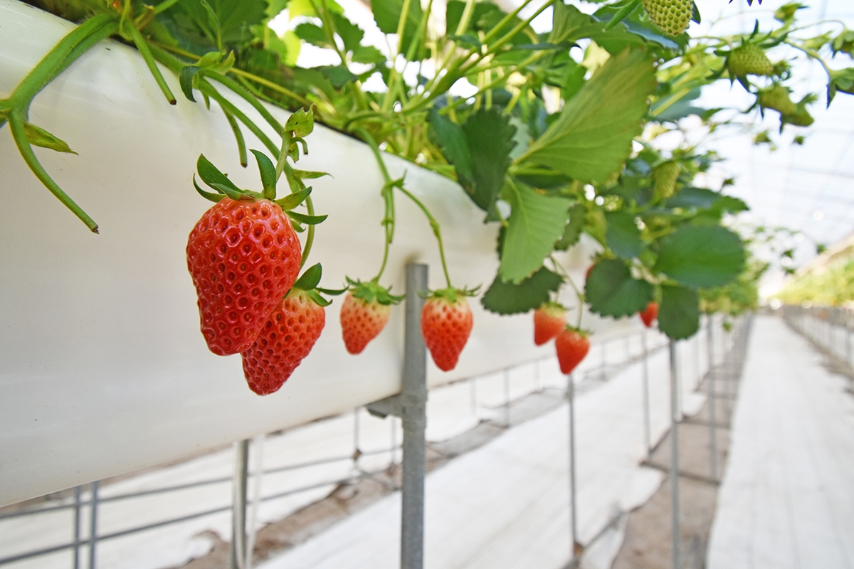 不要な葉やツルを摘む作業は、果実に太陽の光と栄養を集中させ、大きく甘いいちごを育てるためにとても重要。毎日欠かさず、丁寧に行っています。曇りの日が続く時は、光合成の不足によりいちごの味が落ちるのを防ぐため、栄養素を補い、シーズンを通じて常に美味しいいちごを提供できるよう努力を重ねています。