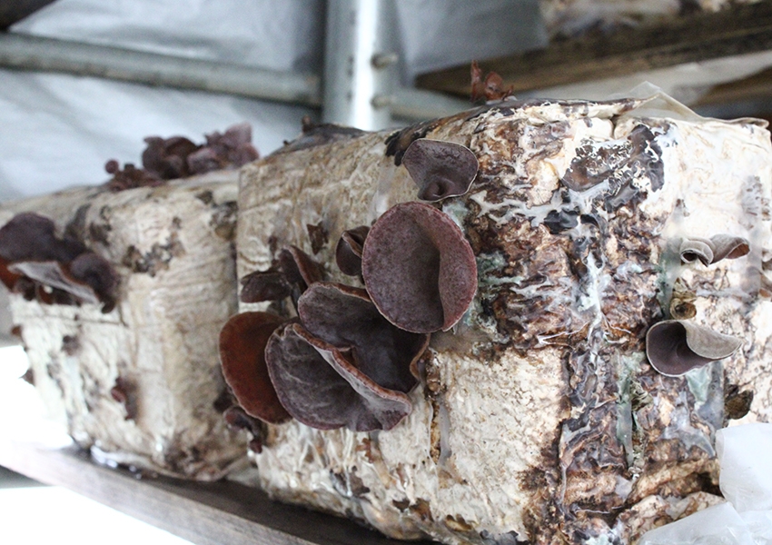 原木しいたけの栽培ハウスを利用して、菌床キクラゲの栽培も行っています。