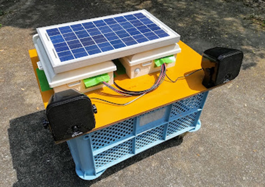 こちらのイノシシ避けマシン。定期的に警戒させる音声とイノシシにセンサーが反応したらびっくりさせる音声が流れるようになっています。
