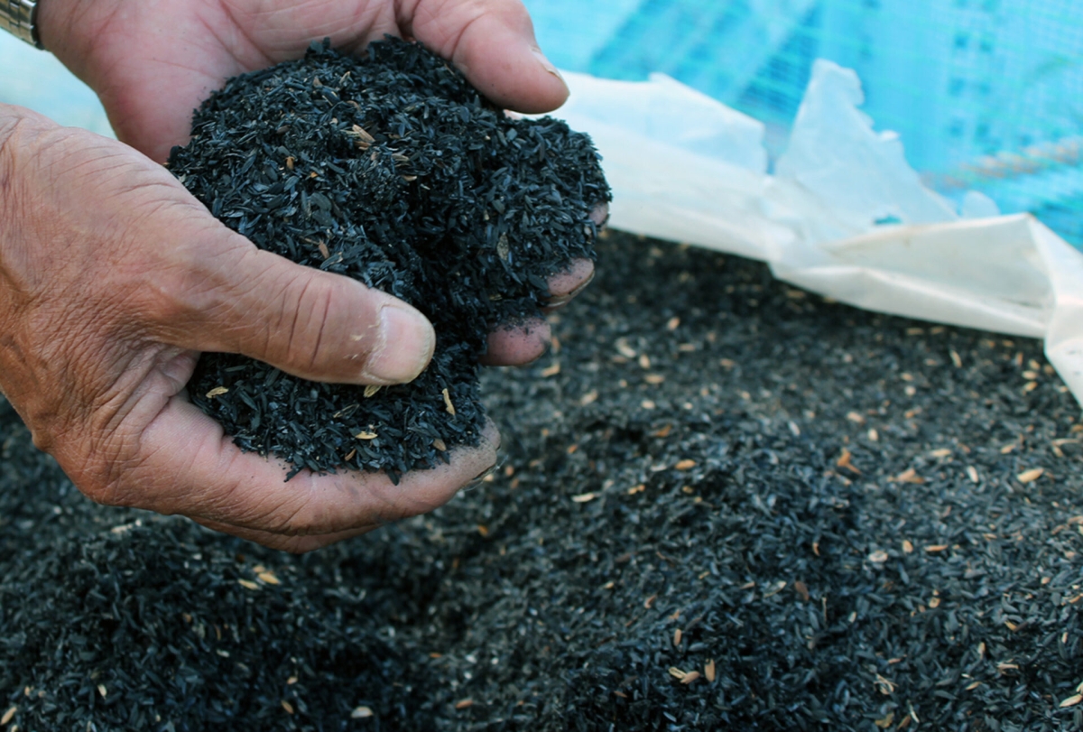 知人のコメ農家から、もみ殻を譲り受け、約20時間かけて夫婦で仕上げた自家製の燻炭(くんたん)。
