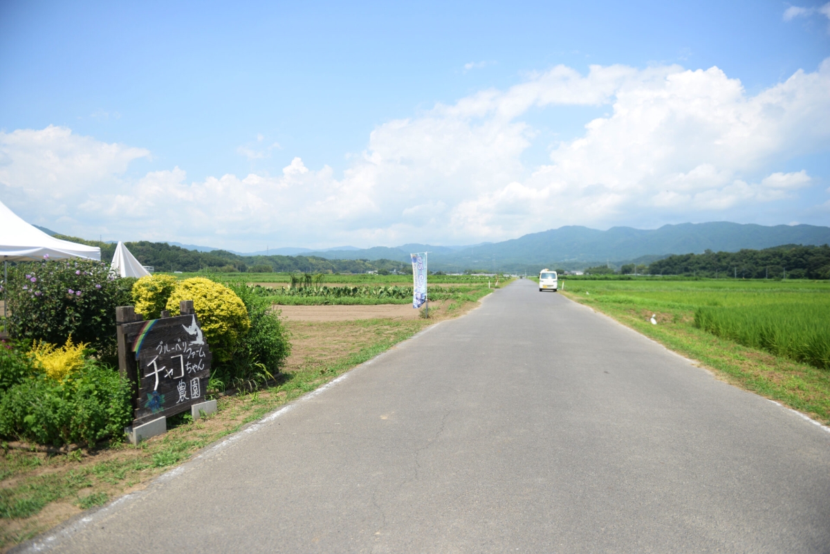 農園の周囲には人工物がなく、のどかで広大な景色が広がっています。まっすぐ続く農道の向こうには、二ッ箭山と水石山の美しい山並みが。「夕暮れの景色もほんとうに素晴らしいんです。毎日感動をもらっています」と辰野さん。