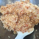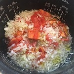 炊飯器に米、②、オリーブオイル、コンソメ、水を入れて炊く。 ※水はいつもの分量よりトマトの水分量90ccくらい除く