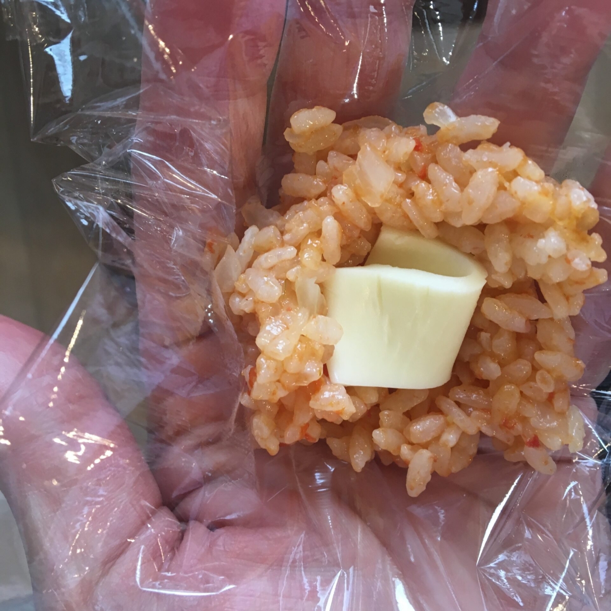 ラップにご飯をのせて真ん中にチーズを入れ、お好みの形にする。