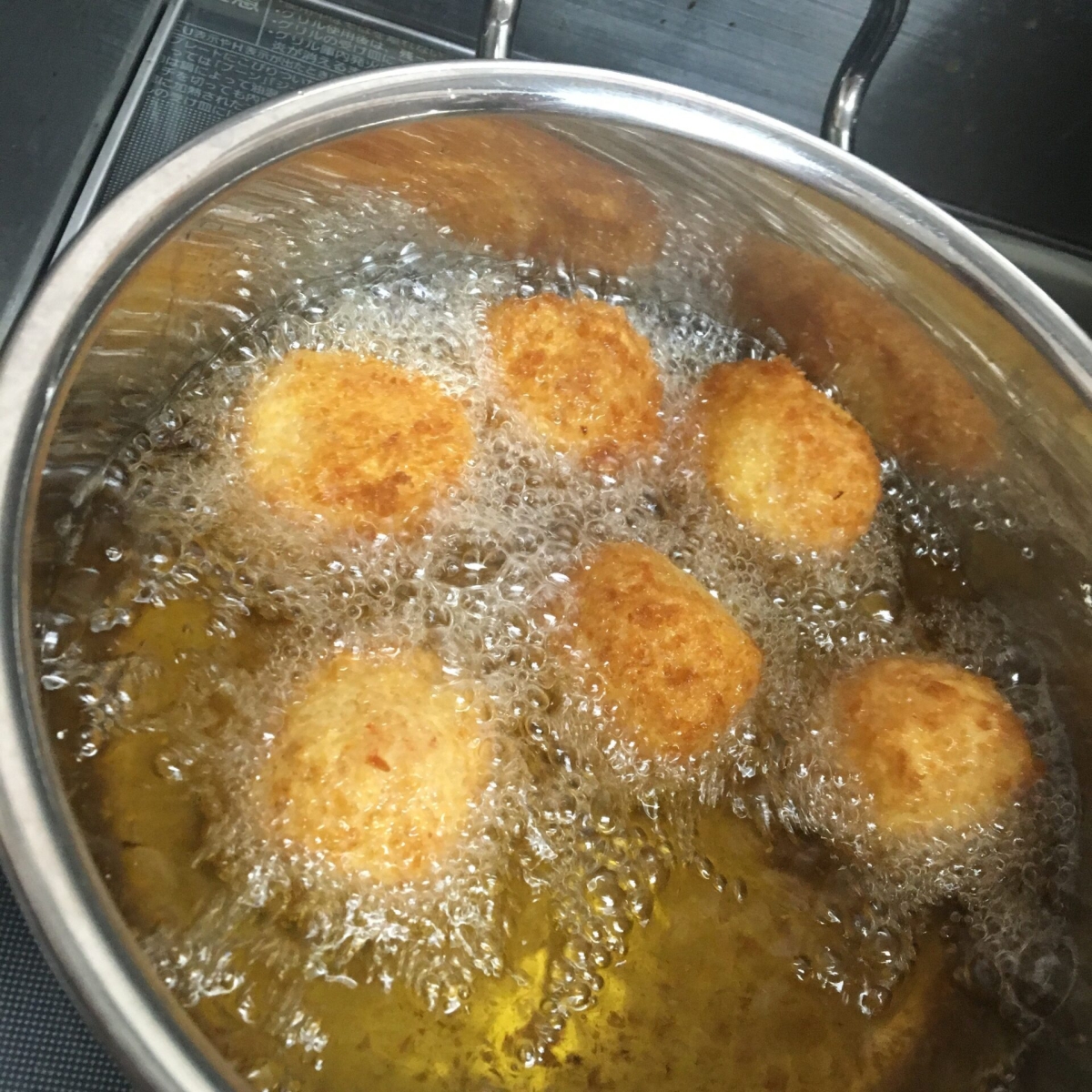 小麦粉、卵、パン粉をつけ、表面がきつね色になるまで揚げる。