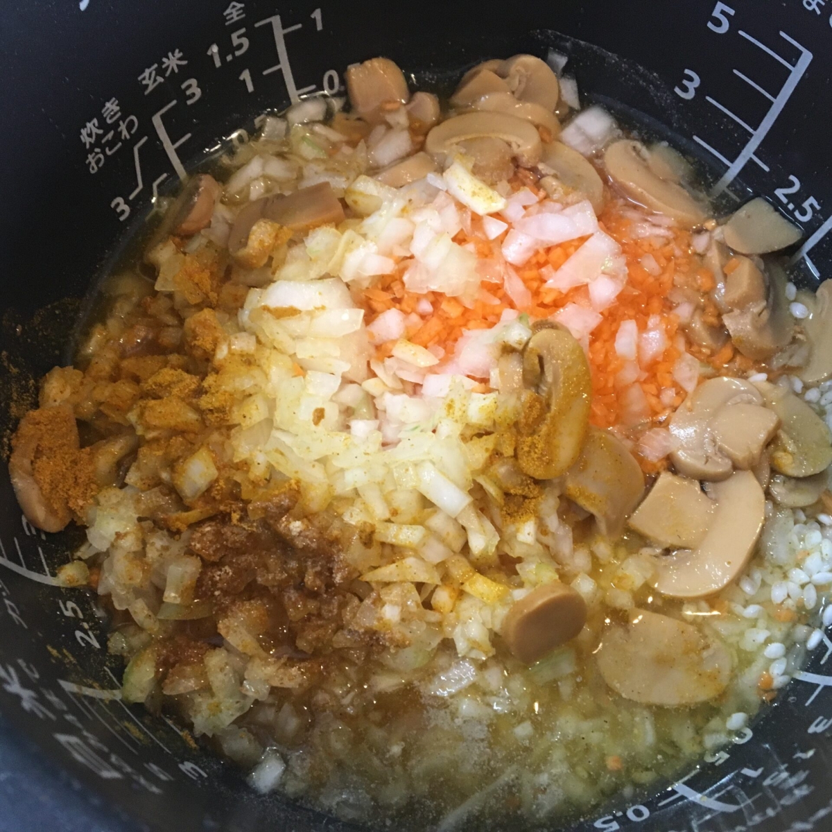 米、玉ねぎの半量、★を入れ、堅めの水加減で炊く。
