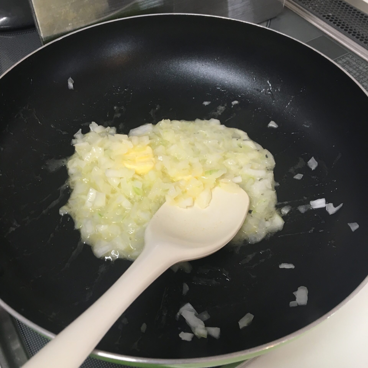 フライパンにバターを入れ、残りの玉ねぎを炒める。その後、小麦粉を入れて焦げないようにしっかり炒める。
