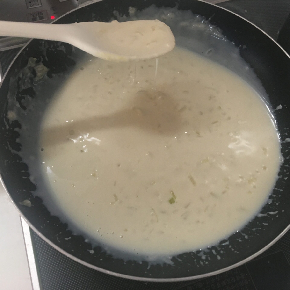 ④に豆乳を少しずつ、よく混ぜながら何回かに分けて入れ、コンソメを加える。
