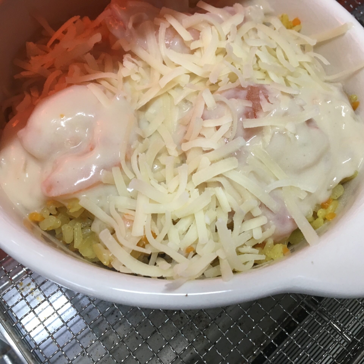 炊きあがったご飯を耐熱皿に広げて⑥をかけ、チーズをのせて焦げ目がつくまでオーブントースターで焼く。