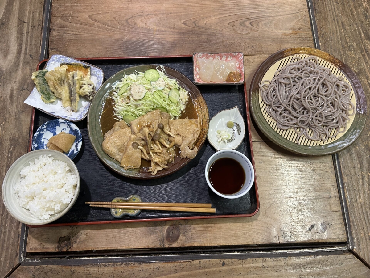 季節の天ぷらや、焼肉がセットになったボリュームある一品。ご飯や蕎麦の量を調整して注文できることから男女問わず人気のメニュー。