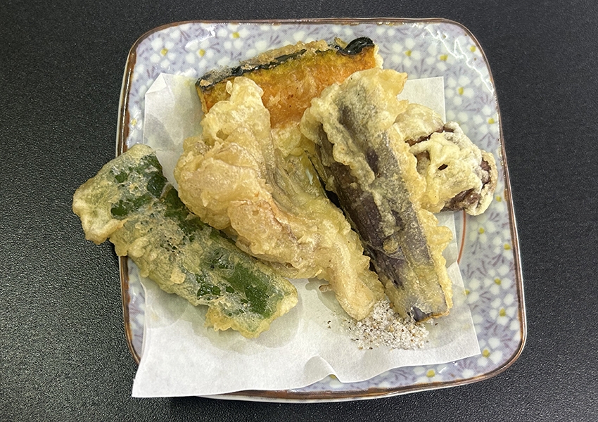 小鉢の料理もすべて手作り。地元の新鮮な野菜を天ぷらにし、特製のえごま塩でいただきます。サクサクとした衣と野菜の自然な甘みが感じられ、栄養たっぷりなえごま塩のプチプチとした食感と合わさるとやみつきになるおいしさ。
