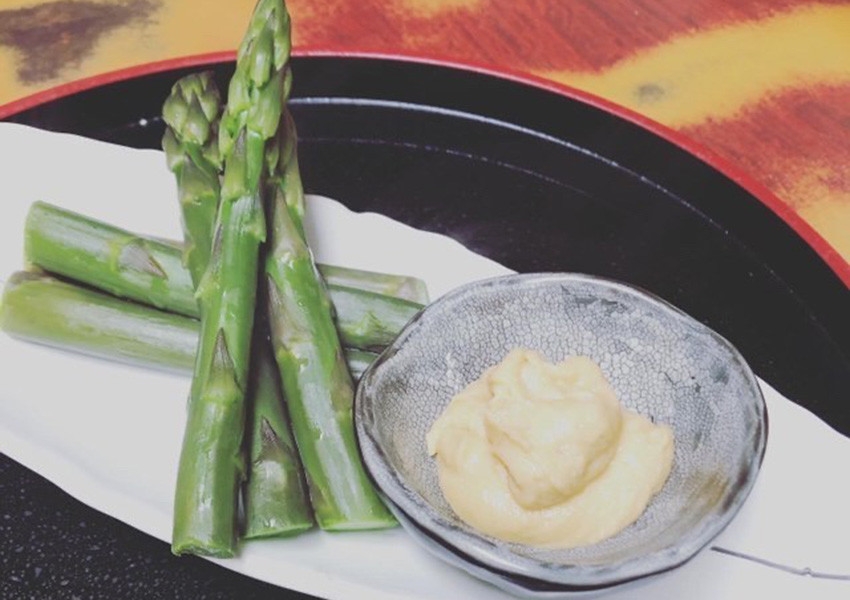 シンプルに塩で茹でたアスパラをマヨネーズ味噌をつけていただく一品