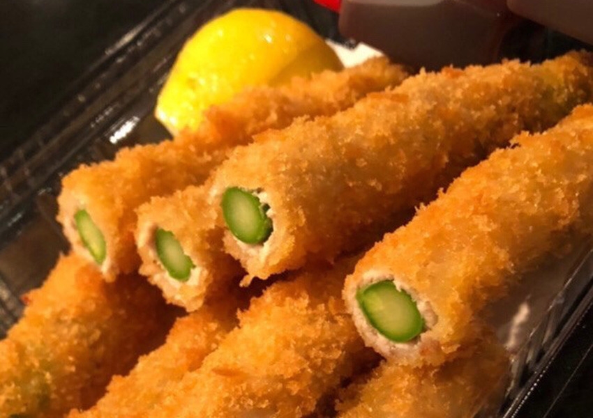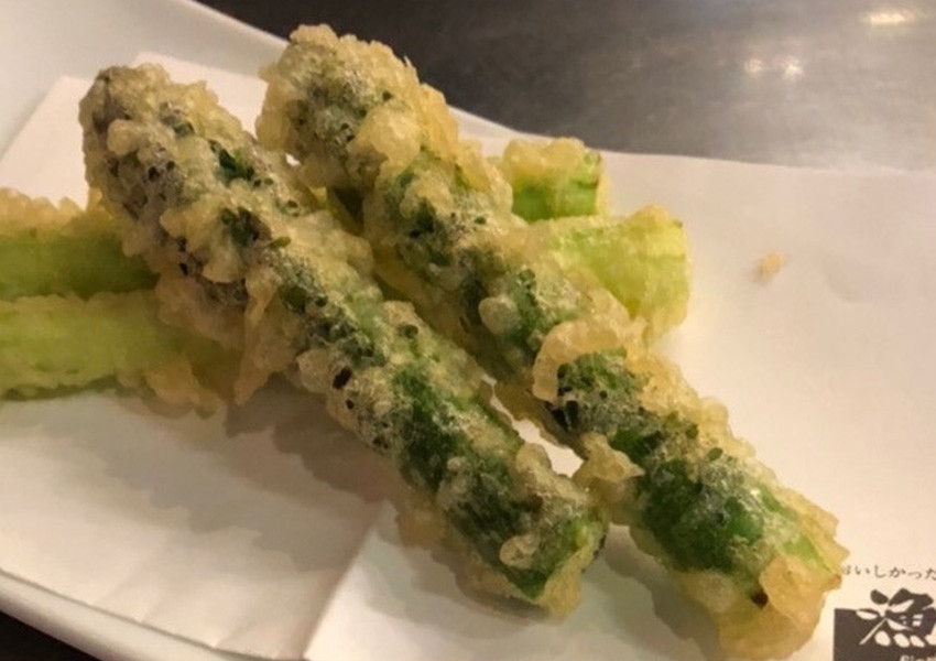 春から秋頃にかけてはいわき産のアスパラガスを使った「アスパラ天ぷら」、「アスパラ塩茹」、「アスパラ肉巻きフライ」など、漁夫三町目店では「いわきのめぐみ」を最大限に活用して、その時期に一番おいしい食べ方・味付けで旬の料理を提供しています。