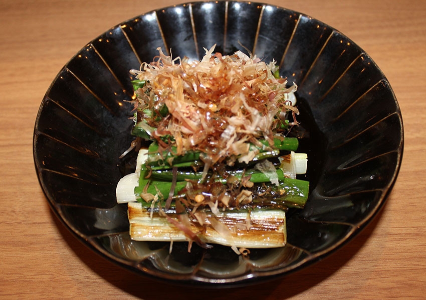 焼いたネギに鰹節・辛子醤油をかけたサッパリした味の一品【夏以外の期間限定】