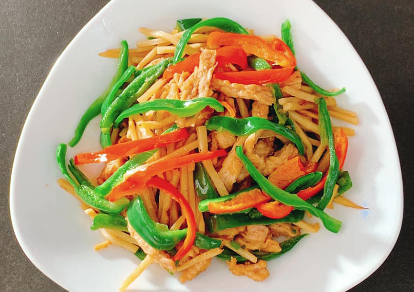 いわき産のピーマンと赤ピーマンを使った青椒肉絲。
