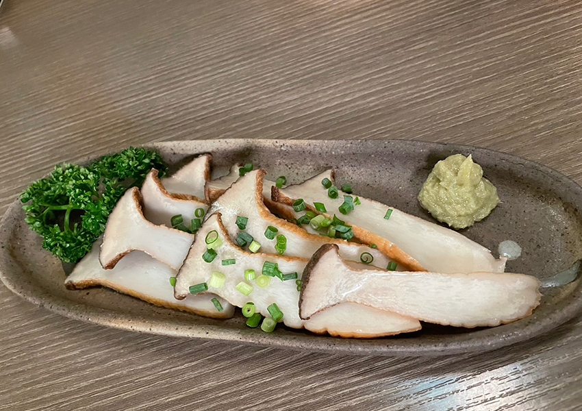 表面を軽く素揚げしたエリンギを醤油とわさびでいただくシンプルな料理。