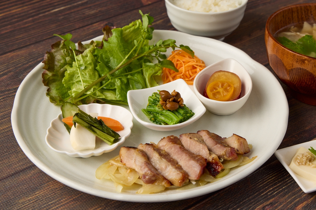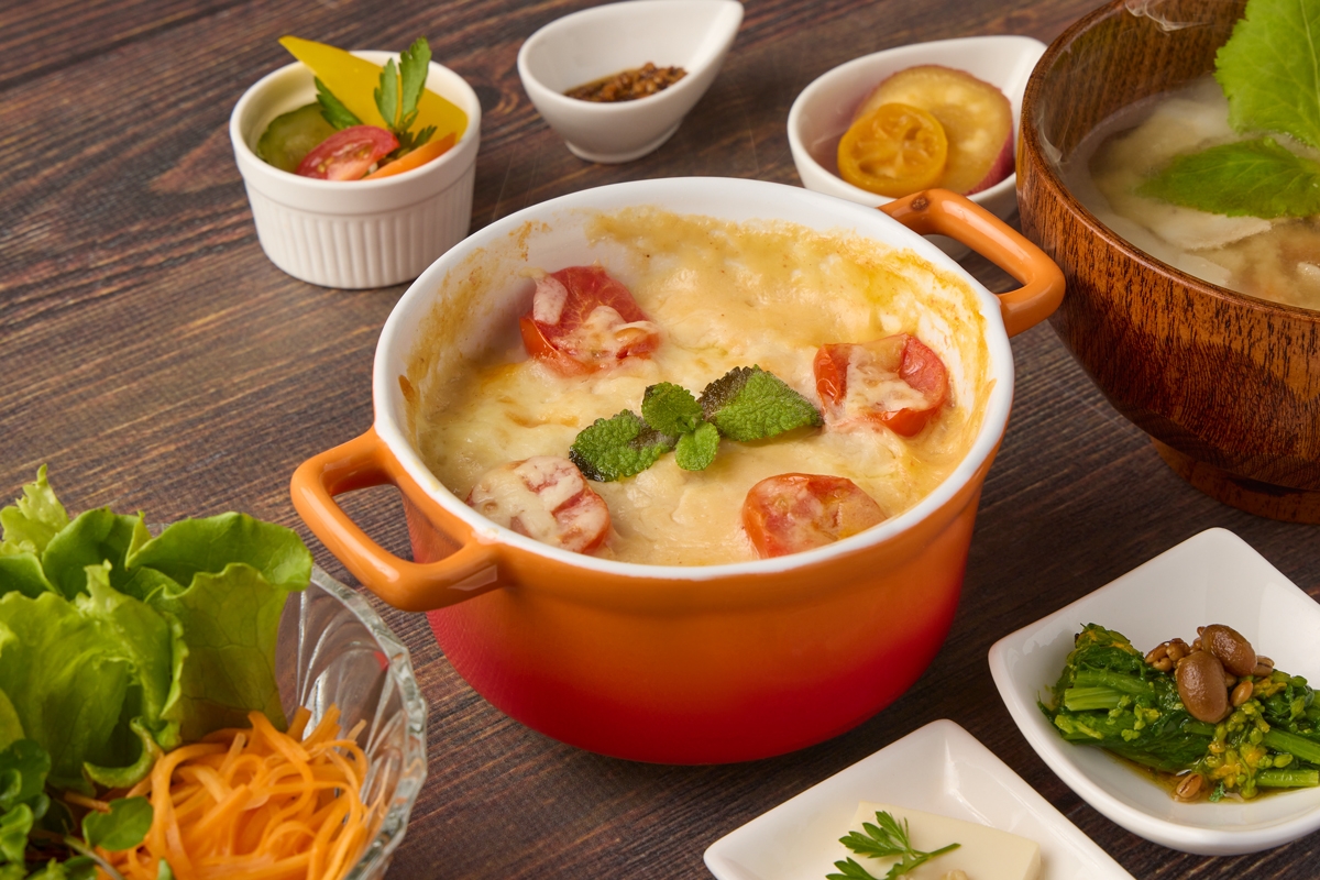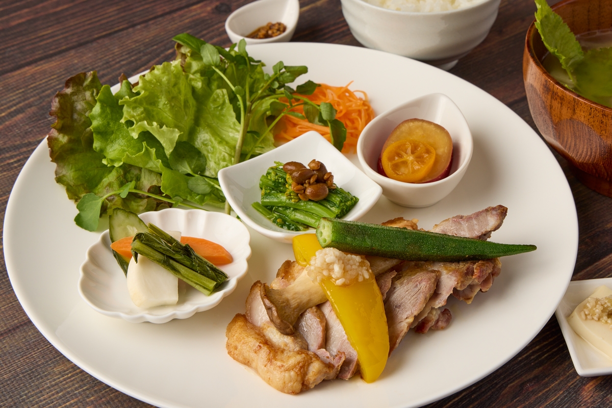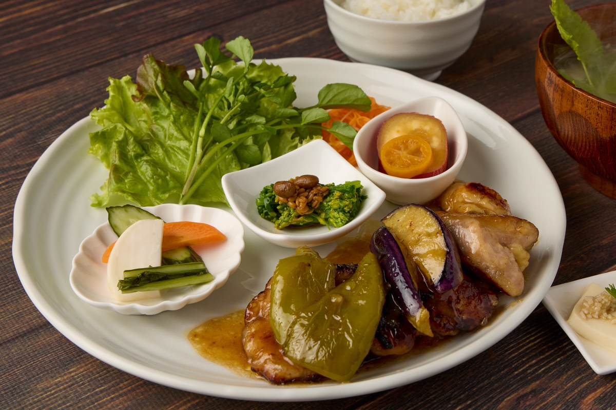 白ナスやきゅうり、ズッキーニなど、多彩な自社栽培の野菜を使った、発酵食品ソムリエ監修のメニューが楽しめます。ランチメニューでは、全6種類の発酵ランチを提供しています。
