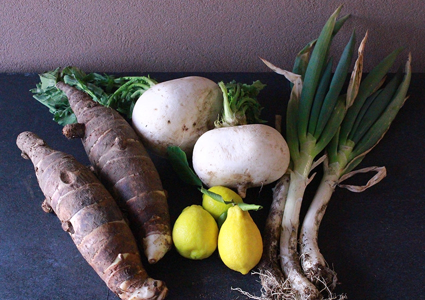 この日仕入れたのは、(左から)京芋や聖護院かぶ(中央上)、無農薬レモン(中央下)、ねぎの4種の野菜。