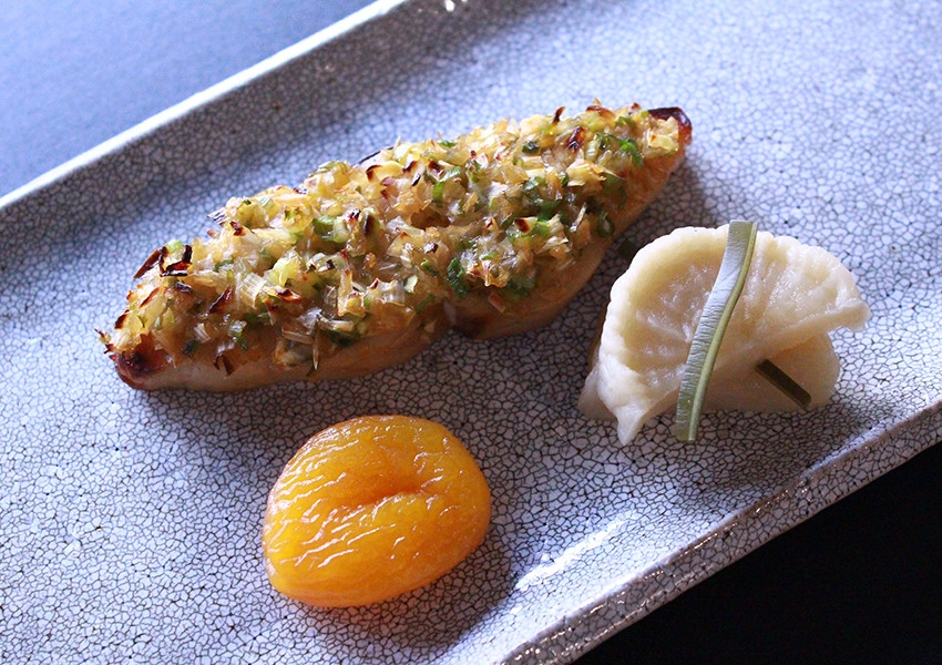 『新宿割烹 中嶋』でも提供していたメニューですが、いわきの皆さんにも是非食べてもらいたいと、山さと農園さんに聖護院かぶの栽培をお願いして再現しました。 提供直前で擦り下ろしたかぶのまろやかな甘みと甘鯛や出汁の旨味がマッチし、絶妙なバランスを醸し出しています。