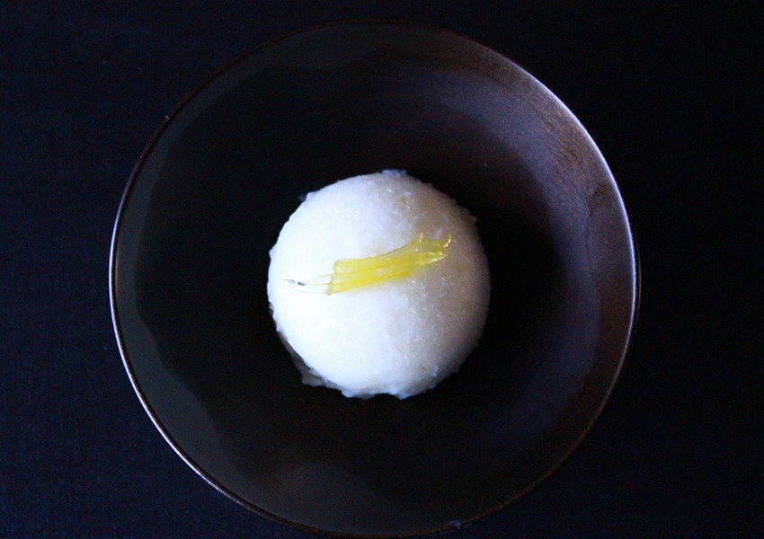 生木葉ファームさんのレモンハウスで丁寧に育てられたレモンは、とにかくフレッシュで皮が薄く、実がびっしり詰まっています。それらを丸ごとコンポートにして、ソルベにしたデザートはコースの締めを飾るのにぴったりです。